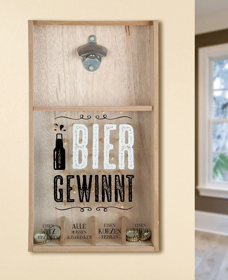 Spiel „Bier gewinnt“ Wand-Flaschenöffner und Kronkorkensammler mit bedrucktem Klarglas und Einwurfmöglichkeit unter dem Flaschenöffner der eingeschmissene Kronkorken nimmt seinen Weg durch das Stäbchenlabyrinth und landet am Ende in einem der 4 Sammelbehälter: