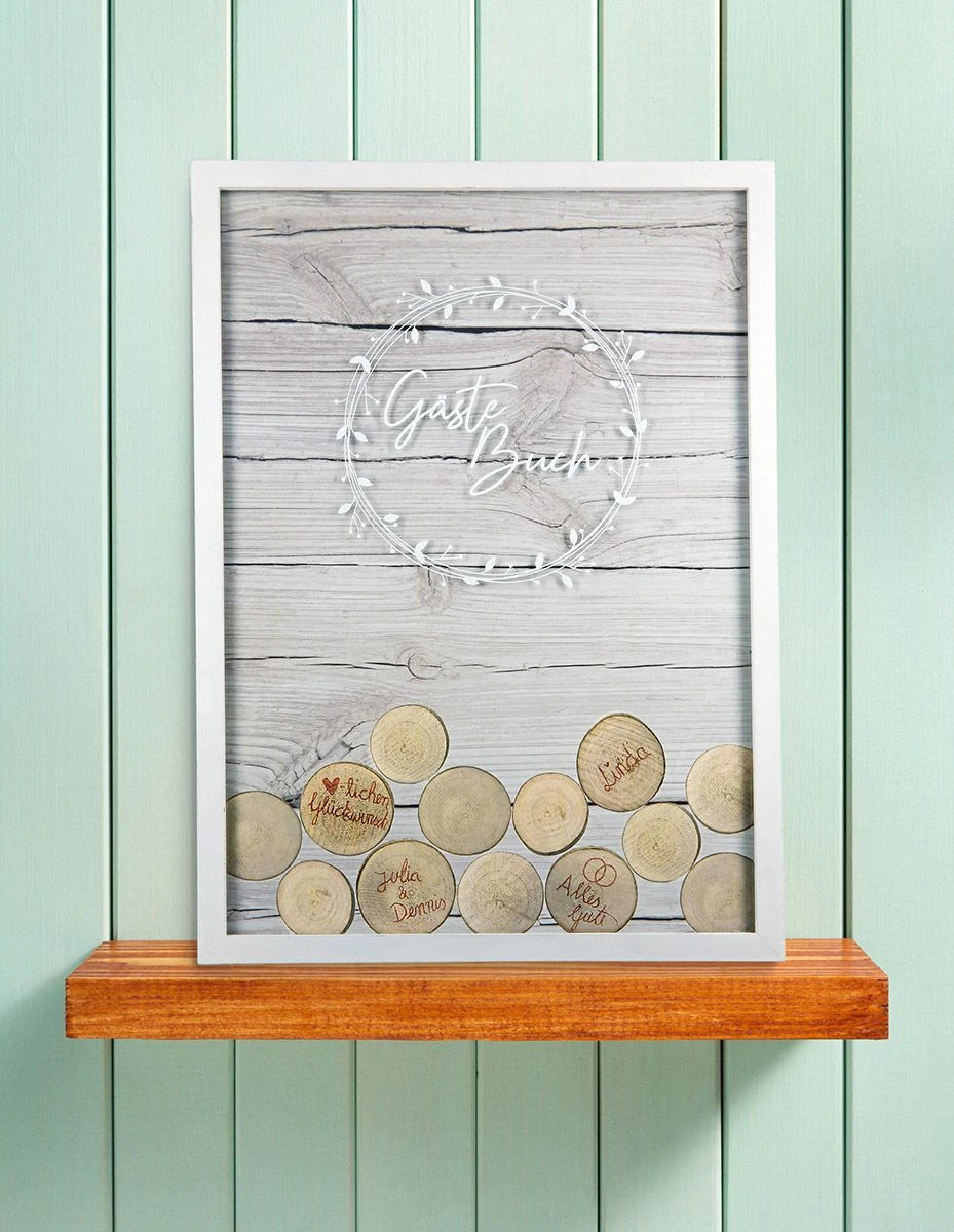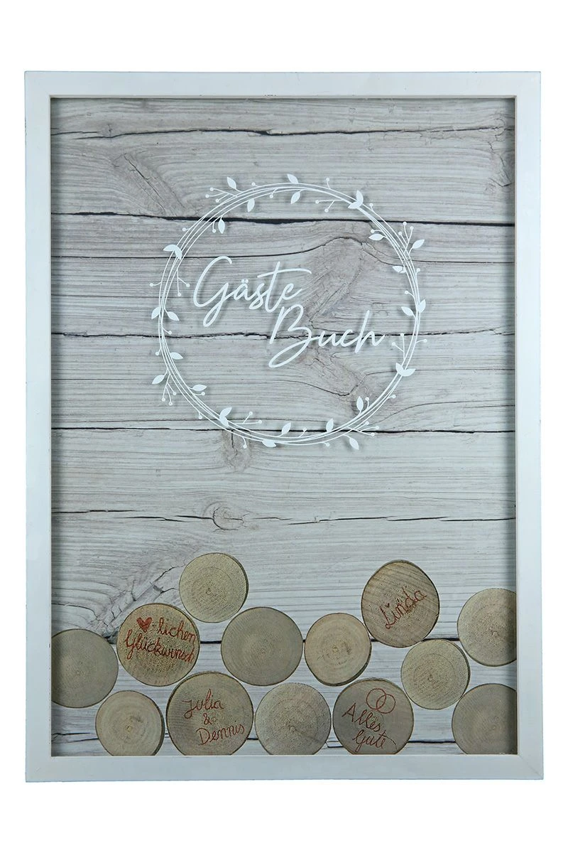 Rahmen in weiß mit 55 Holzscheiben zum Beschriften im Sichtfenster