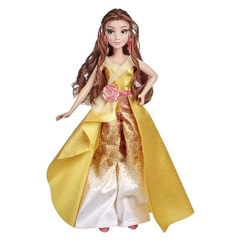 Ihr Stil und ihre Accessoires präsentieren die beliebte Prinzessin als selbstbewusste, moderne Frau. Fans werden von dieser atemberaubenden Puppe begeistert sein. Sie erinnert an die Filmszene, in der Belle die Treppen des Palasts hinabschreitet. Diese herrlich bekleidete Belle Puppe kommt in einem einzigartigen und modernen Stil, der durch Belles Welt inspiriert ist, und wartet darauf, im Rampenlicht zu erscheinen. Ihr stylisch glitzerndes, goldenes Kleid ist vorn offen geschneidert und offenbart so ihre wallenden Hosen, die sie mit einem Gürtel mit Rosen-Schnalle trägt.