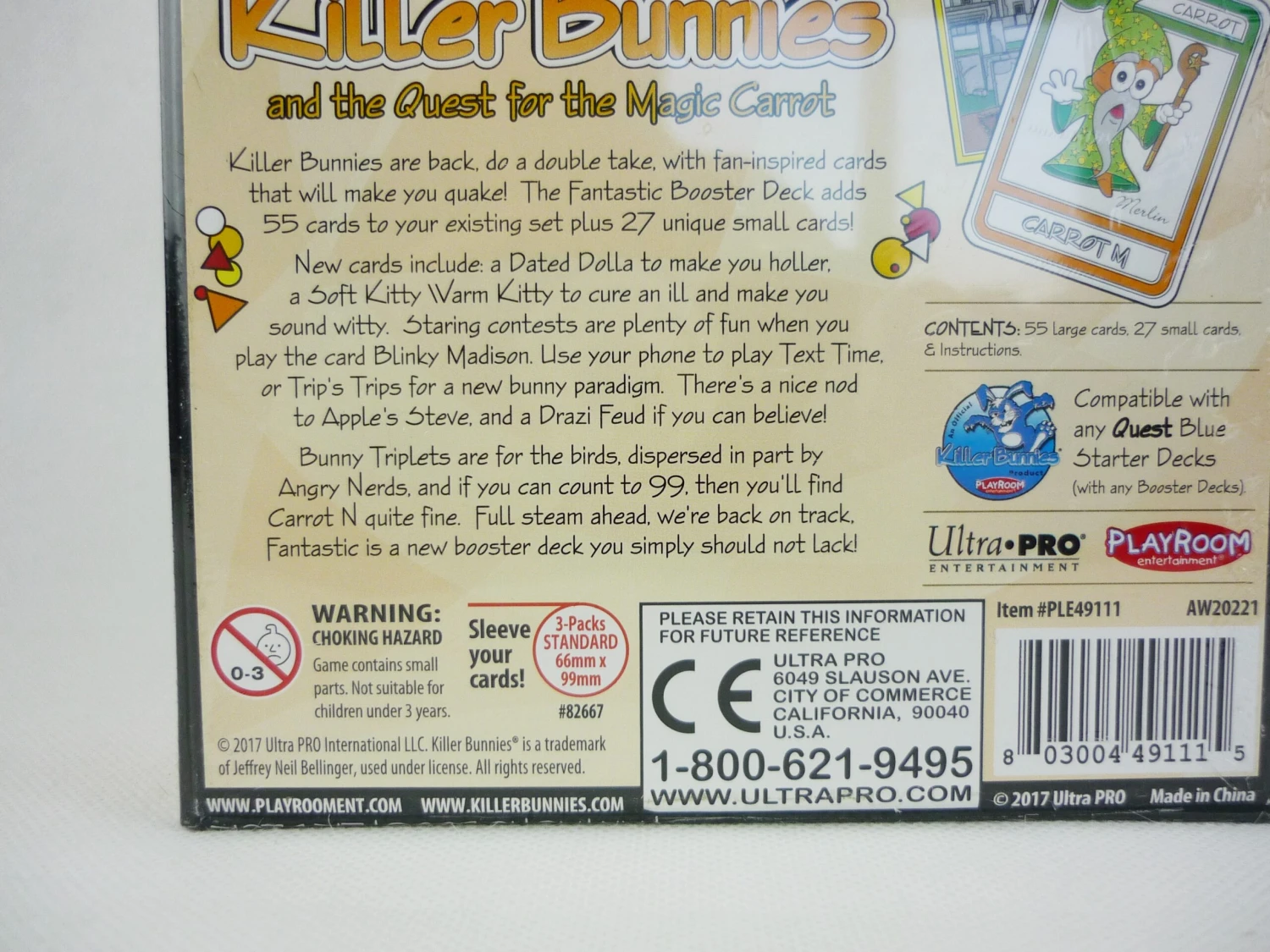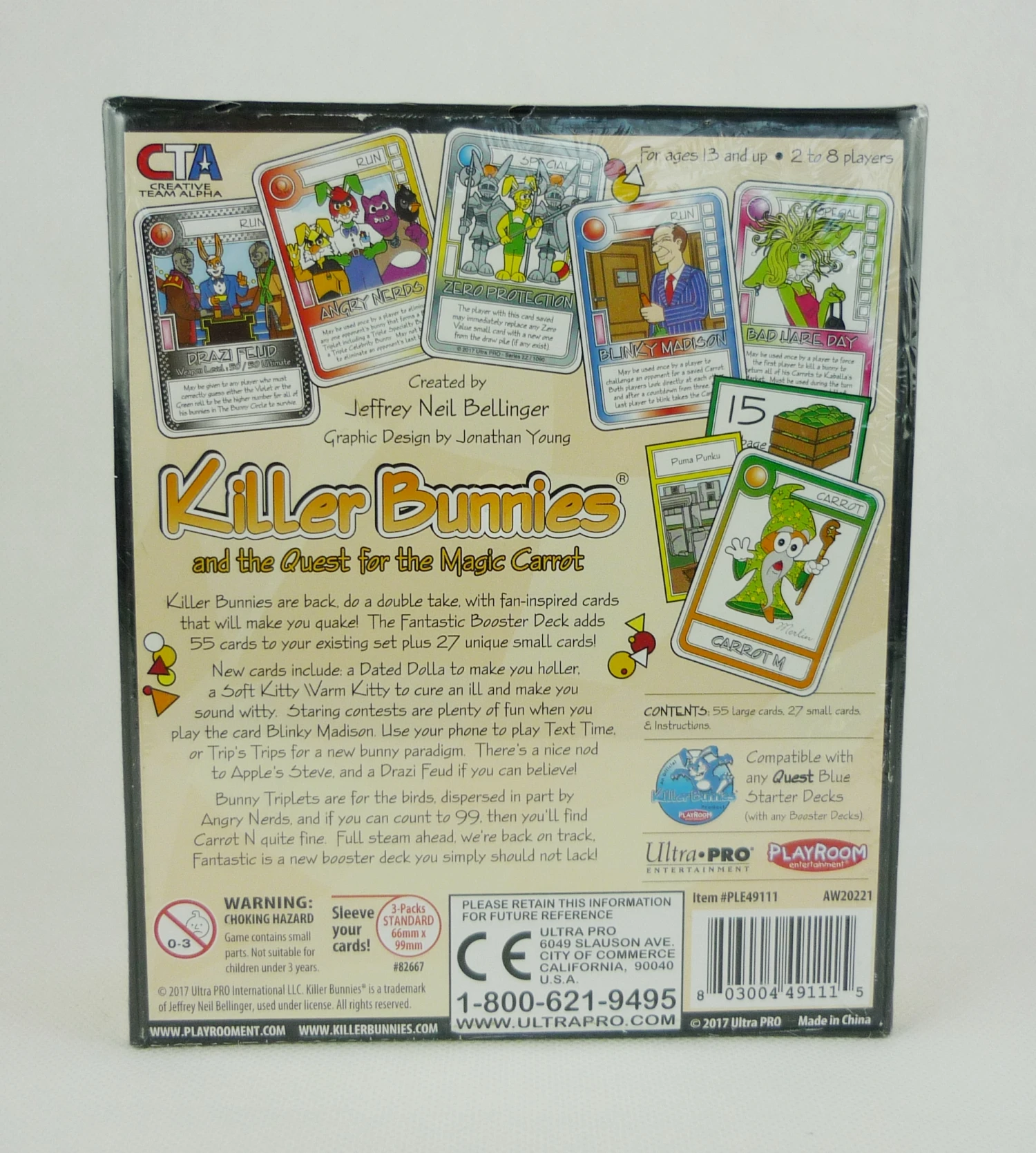 Killer Bunnies are back, do a double take, with fan-inspired cards that will make you quake! The Fantastic Booster Deck adds 55 cards to your existing set plus 27 unique small cards.