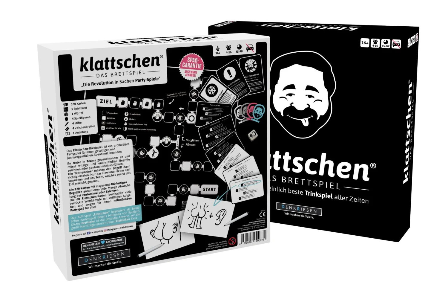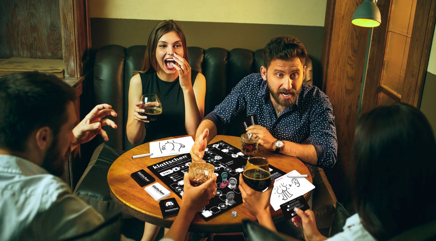 Das klattschen-Brettspiel ist ein großartiges Partyspiel für einen geselligen und (un-)vergesslichen Abend mit Freunden. Ihr tretet in Teams gegeneinander an und müsst witzige und unanständige Begriffe zeichnen oder pantomimisch vorführen. Die Teampartner müssen den Begriff dann richtig erraten. Nur das Gewinner-Team darf vorrücken und das Team, welches zuerst das Ziel erreicht, gewinnt.