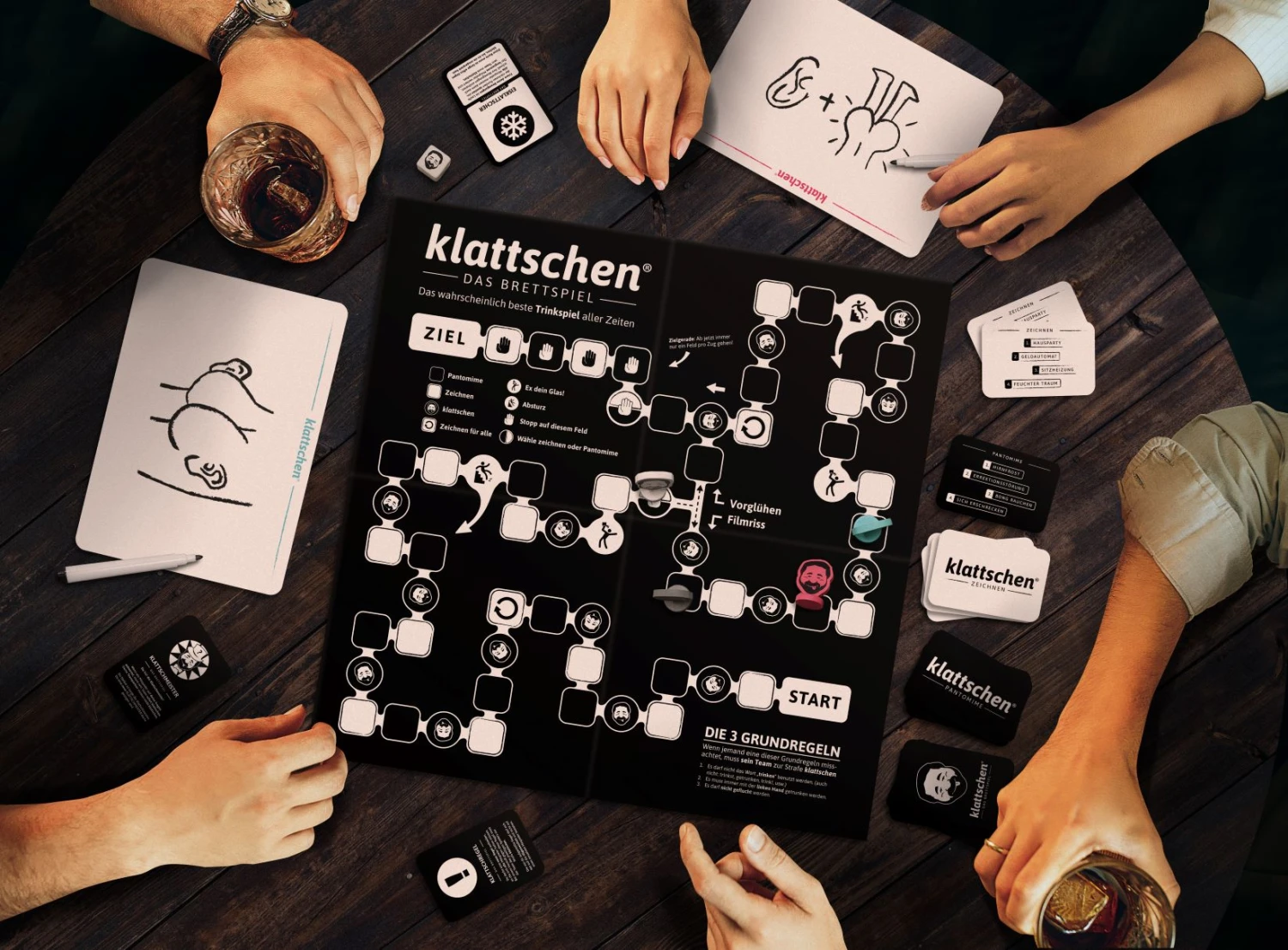 Die 3 Grundregeln müssen über das ganze Spiel beachtet werden. Wenn jemand eine dieser Grundregeln missachtet, muss das gesamte Team zur Strafe einen Schluck nehmen, im Spiel auch „klattschen“ genannt.