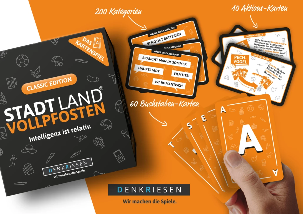 Das offizielle Kartenspiel von STADT LAND VOLLPFOSTEN mit 120 Spielkarten für ein unvergessliches Spielerlebnis unter Freunden.